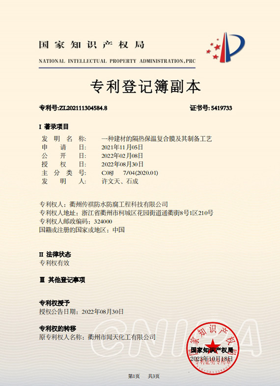 衢州傳祺新材料科技有限公司是衢州市聞天化工有限公司的下屬企業;衢州市聞天化工有限公司成立于2003年,是國內最早研發、生產氟碳涂料的企業之一。衢州傳祺新材料科技有限公司成立于2017年,公司專注于高分子氟材料的開發和含氟材料在防腐、防水領域的應用。經過6年的不懈努力,已獲得了化工和建筑領域六項國家發明專利授權和兩項新產品科技成果獎,參與了中國建筑材料流通協會《房屋修繕防水工程規范》標準的編制工作,中建協涂裝委員會浙西工作站設立在我公司。